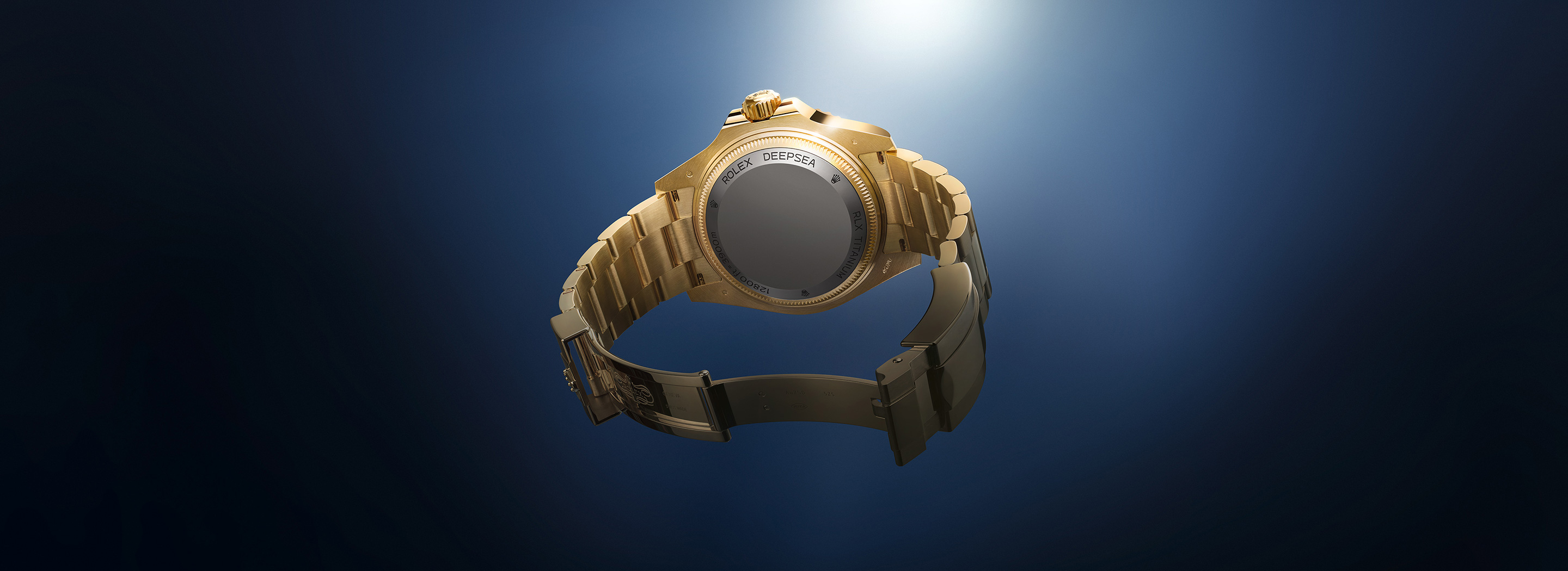 Das Oyster-Band der Rolex Deepsea ist mit einer Oysterlock-Sicherheitsfaltschließe ausgestattet, die versehentliches Öffnen verhindert. Es ist mit dem Rolex Glidelock-Verlängerungssystem versehen. Diese von der Uhrenmarke entwickelte, patentierte raffinierte Vorrichtung mit Zahnschiene ist in die Schließe integriert und erlaubt eine fein abgestufte Verlängerung des Armbandes ohne Einsatz jeglicher Werkzeuge. Das Oyster-Band der Rolex Deepsea in 18 Karat Gelbgold verfügt über – von der Marke entwickelte patentierte – Keramikeinsätze in den Bandelementen, durch die es an Geschmeidigkeit und Langlebigkeit gewinnt.