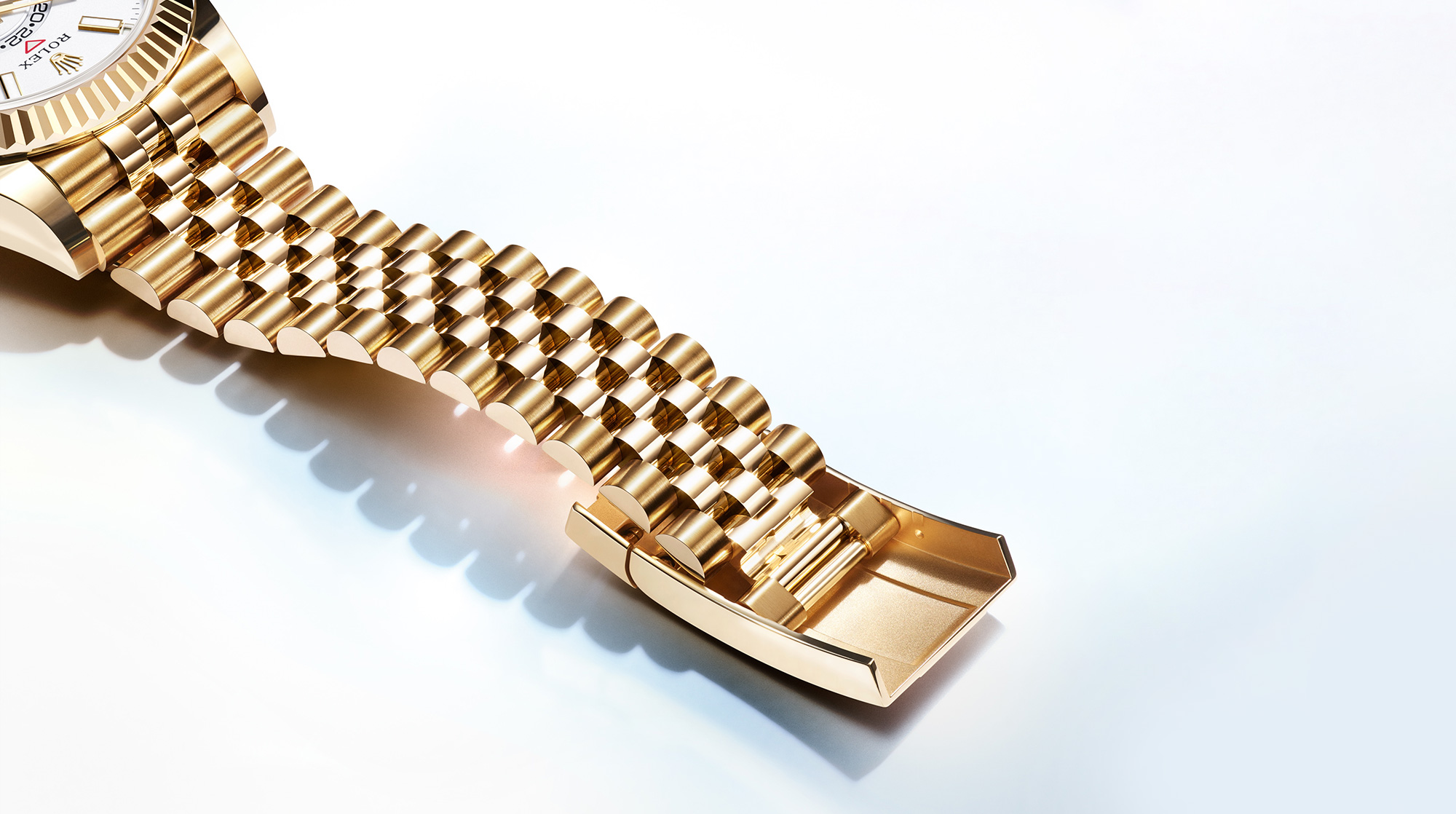 Beide Jubilee-Bänder – jeweils mit Oysterclasp-Schließe, der traditionellen Schließe der Sky‑Dweller – verfügen wie die meisten Rolex Armbänder aus Edelmetall über Keramikeinsätze in den Bandelementen.